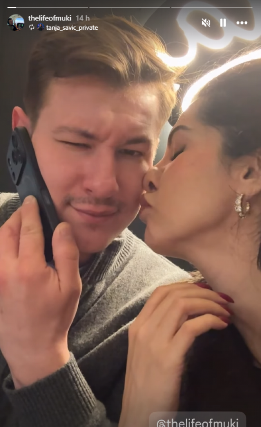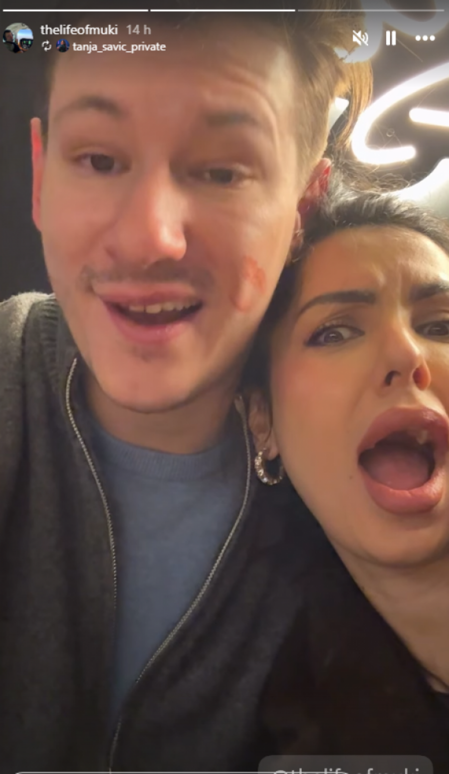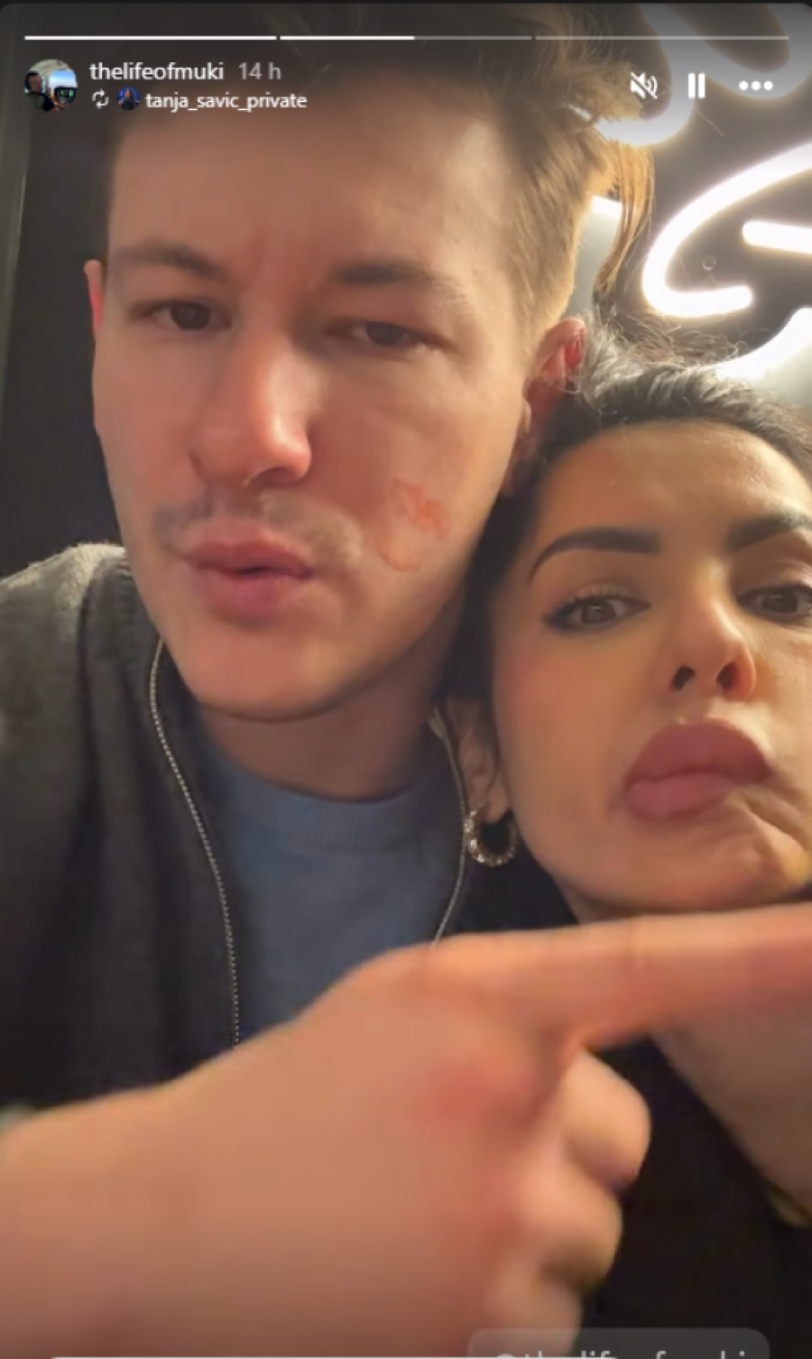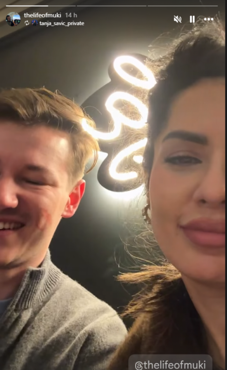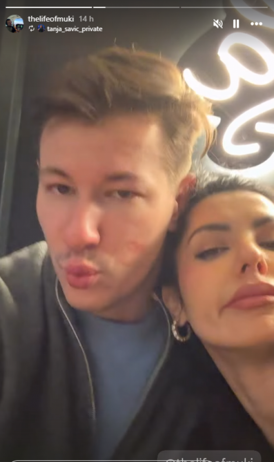 Na seriji fotografija koje su osvanule na njihovim storijima, jasno se vidi da se Tanja i Muki ne odvajaju, a pevačica je u naletu nežnosti odlučila da jasno stavi do znanja čiji je on muškarac. Dok je Muki pokušavao da obavi telefonski razgovor, Tanja ga je "napala" poljupcima, a rezultat je bio više nego očigledan - veliki trag crvenog karmina ostao je direktno na njegovom obrazu.