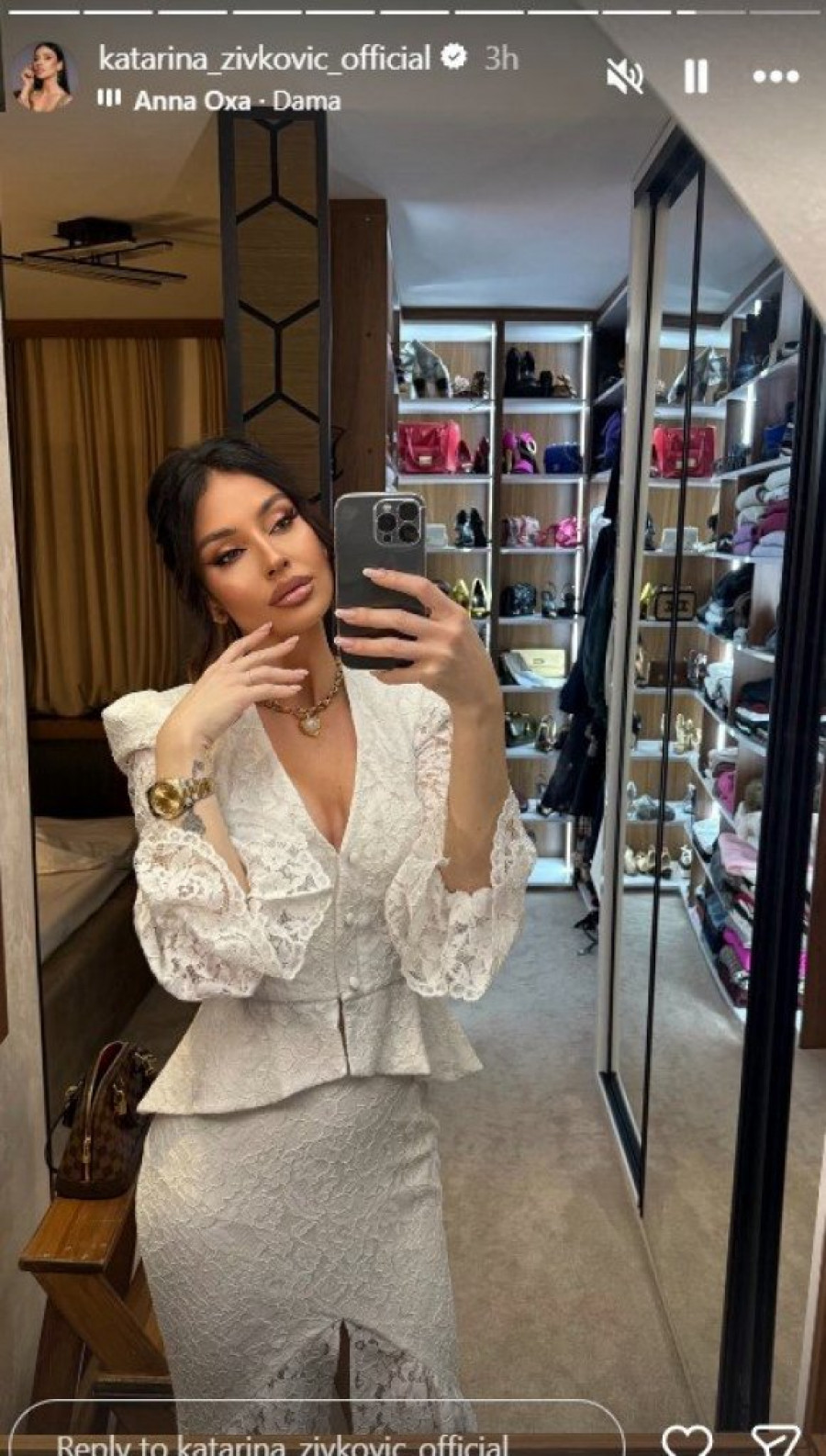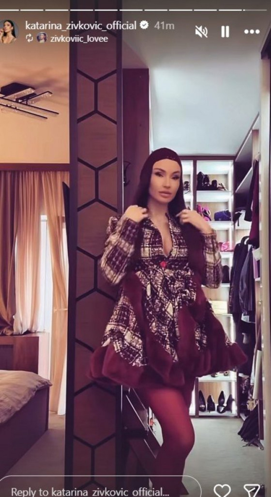 Pevačica Katarina Živković nedavno je izazvala veliku pažnju javnosti, posebno među nežnijim polom, kada je na društvenim mrežama podelila delić svog impresivnog garderobera. U snimcima koje je objavila na Instagramu, vidimo da je njen garderober pravilan prostor u kojem se ogledala nalaze na sve strane. Ova neobična i savremena postavka čini da ceo prostor izgleda luksuzno i moderno. Mnoge pratioce je očarala raskošna kolekcija skupocenih komada odeće, koje pevačica često nosi. Njena sposobnost da spoji stil i eleganciju u svakodnevnim kombinacijama dodatno je podigla interesovanje za njen modni izričaj.