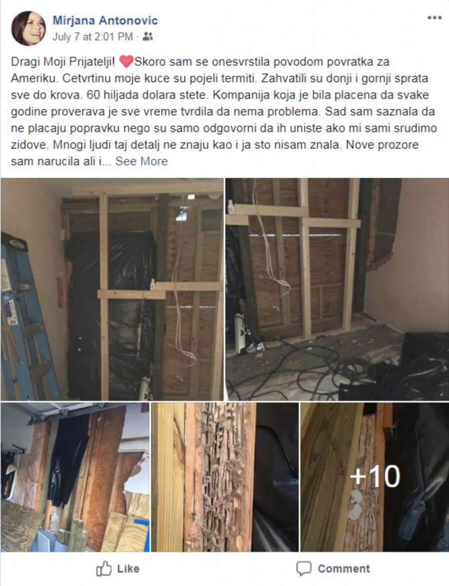 - Dragi moji prijatelji! Skoro sam se onesvestila povodom povratka za Ameriku. Četvrtinu moje kuće su pojeli termiti. Zahvatili su donji i gornji sprat sve do krova, 60.000 dolara štete. Kompanija koja je bila plaćena da svake godine proverava je sve vreme tvrdila da nema problema. Sad sam saznala da ne plaćaju popravku nego su samo odgovorni da ih uniste ako mi sami srušimo zidove. Mnogi ljudi taj detalj ne znaju kao i ja što nisam znala. Nove prozore sam naručila, ali isporuka je šest nedelja. Devin je rušio zidove dok sam ja bila tamo. Ja bih poludela da sam to videla. Scena kao iz stravičnih filmova. Hvala dragom Bogu za Devinove zlatne ruke, momak koji još uvek uspeva da me zadivi. Molim sve vas da dobro pregledate vaše kuće i pročitate sitna slova na ugovoru da ne bi i vi prošli kao ja. Ništa se nije videlo spolja dok nije bilo kasno - napisala je Mirjana na društvenoj mreži fejsbuk.