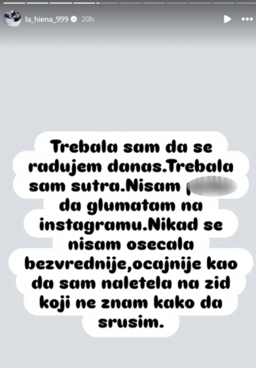 - Trebala sam da se radujem danas.Trebala sam sutra. Nisam pi*** da glumatam na instagramu. Nikad se nisam osećala bezvrednije, očajnije kao da sam naletela na zid koji ne znam kako da srušim - napisala je Dunja Ilić, a zatim je usledila još jedna poruka u kojoj je poručila: