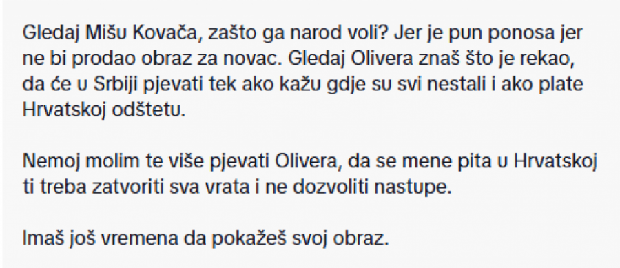 Gledaj Mišu Kovača, zašto ga narod voli? Jer je pun ponosa jer ne bi prodao obraz za novac. Gledaj Olivera, znaš šta je rekao, da će u Srbiji pevati tek ako kažu gde su svi nestali i ako plate Hrvatskoj odštetu.