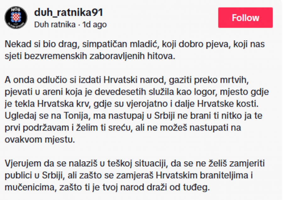 A onda odlučio da izdaš hrvatski narod, gaziti preko mrtvih, pevati u areni koja je devedesetih služila kao logor, mestu gde je tekla hrvatska krv, gde su verovatno i dalje hrvatske kosti. Ugledaj se na Tonija, ma nastupaj u Srbiji, ne brani ti niko, ja te prvi podržavam i želim ti sreću, ali ne možeš nastupati na ovakvom mestu.
