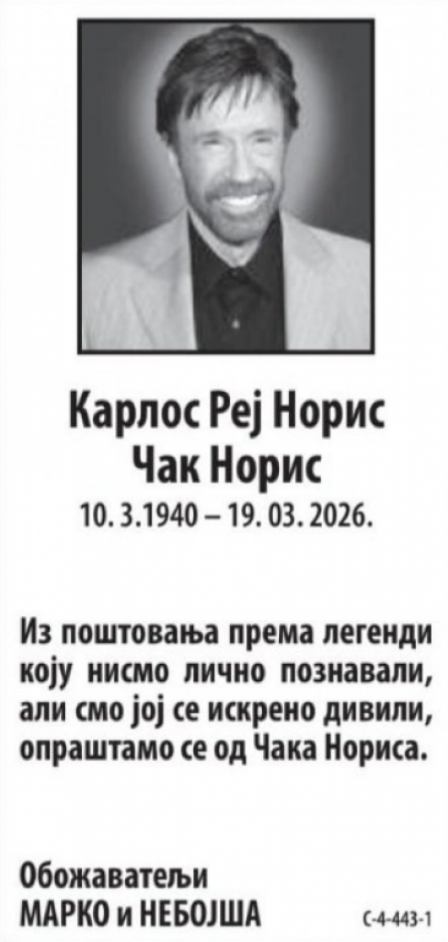 Srbija se na svoj, tradicionalan način oprašta od slavnog holivudskog glumca i majstora borilačkih veština, Čaka Norisa, koji je preminuo pre dva dana u 86. godini. Danas je u dnevnom listu "Novosti" osvanula umrlica posvećena upravo njemu!