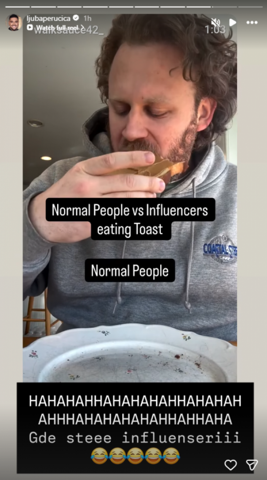Na pomenutom snimku prikazana je razlika između toga kako „obični ljudi“ jedu tost i kako to rade influenseri, uz prenaglašene pokrete, estetiku i način prezentacije hrane, što je mnoge nasmejalo.