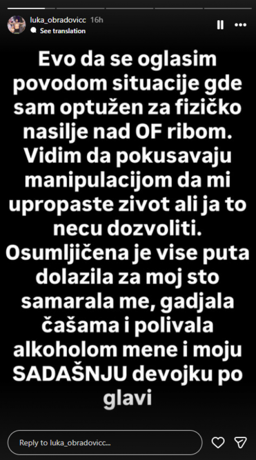 - Evo da se oglasim povodom situacije gde sam opužen za fizičko nasilje nad OF ribom. Vidim da pokušavaju manipulacijom da mi upropaste život, ali ja to neću dozvoliti. Osumnjičena je više puta dolazila za moj sto, šamarala me, gađala čašama i polivala alkoholom mene i moju SADAŠNJU devojku po glavi - započeo je Luka, pa dodao: