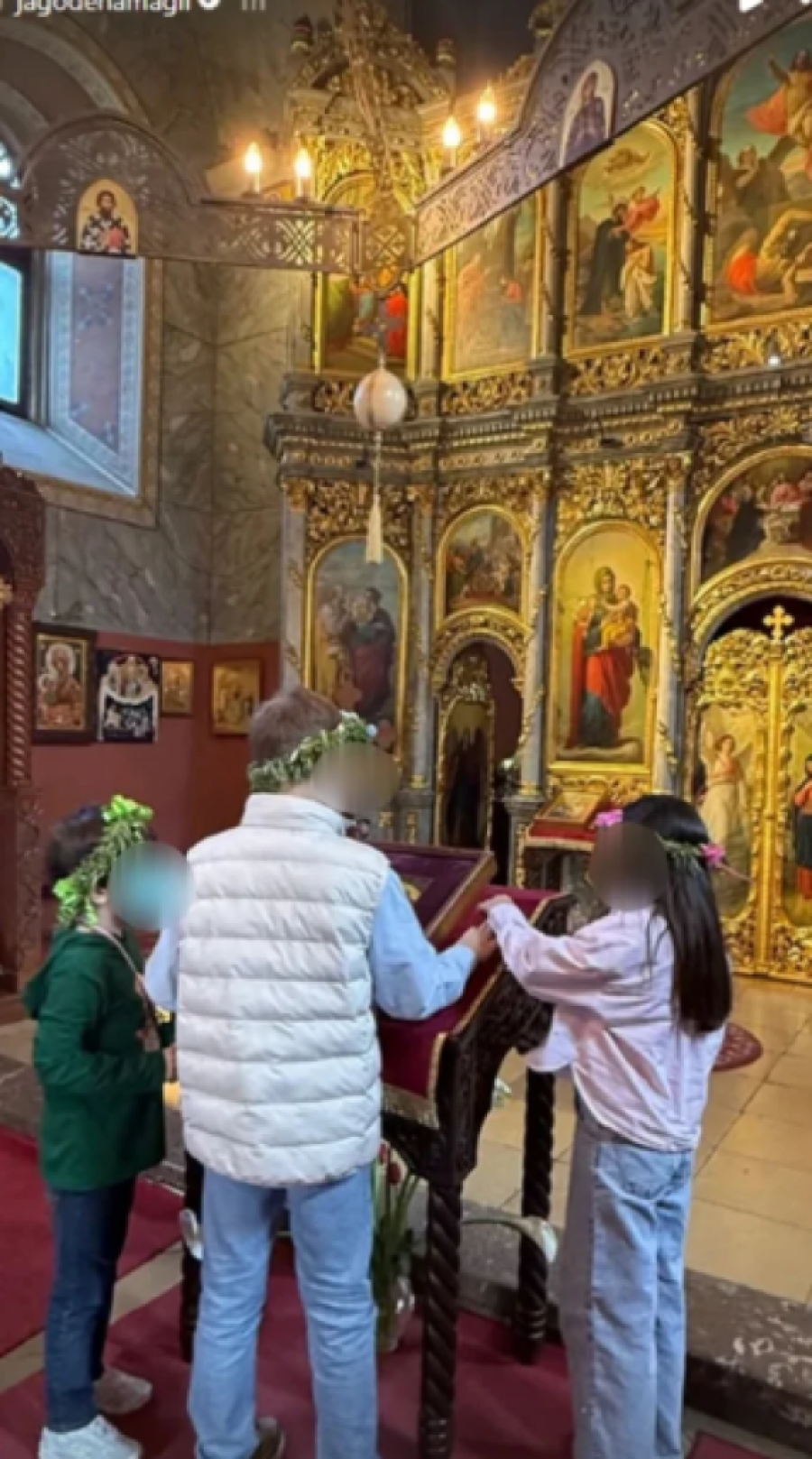 Glumica Jelisaveta Orašanin zajedno sa suprugom, košarkašem Milošem Teodosićem, takođe je obeležila Vrbicu sa svoje dvoje dece, koja su pozirala ispred bogato ukrašenog ikonostasa, sa venčićima od grančica na glavama.