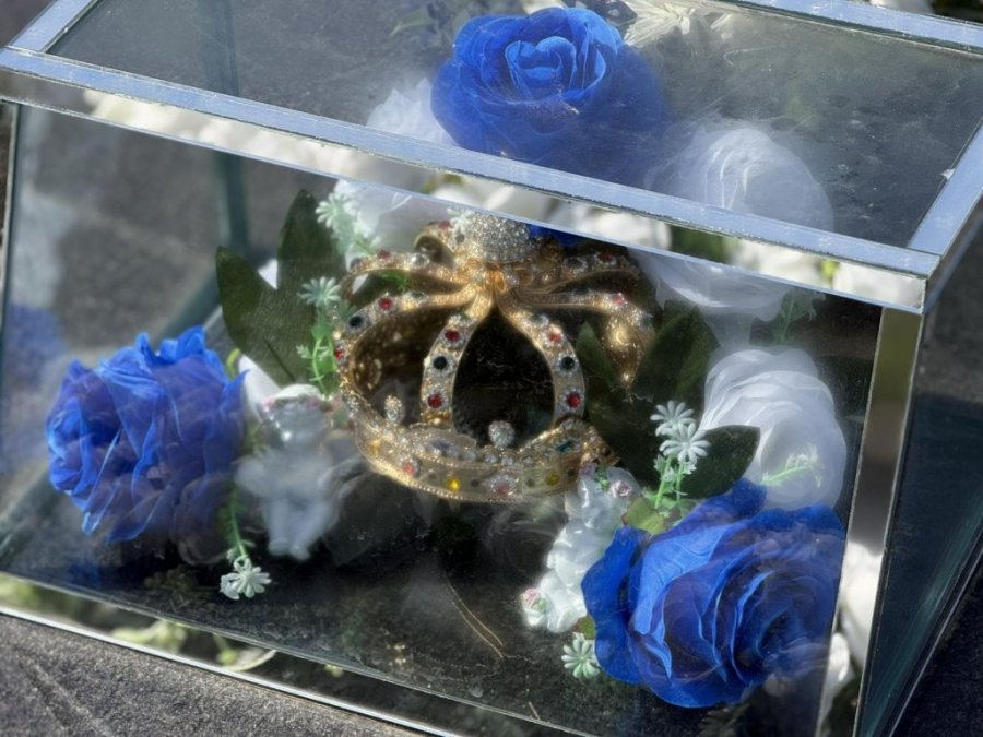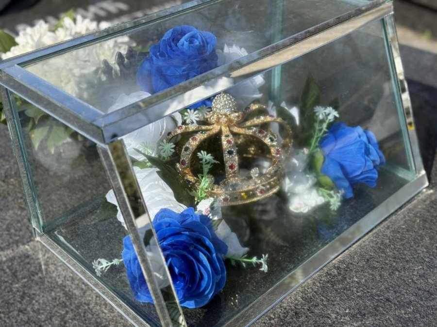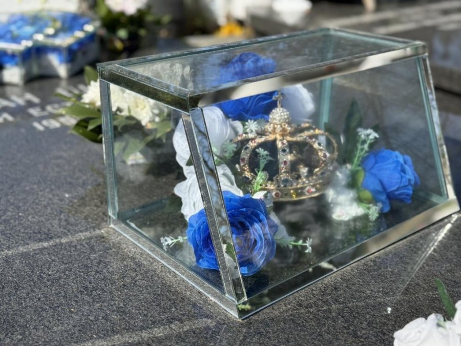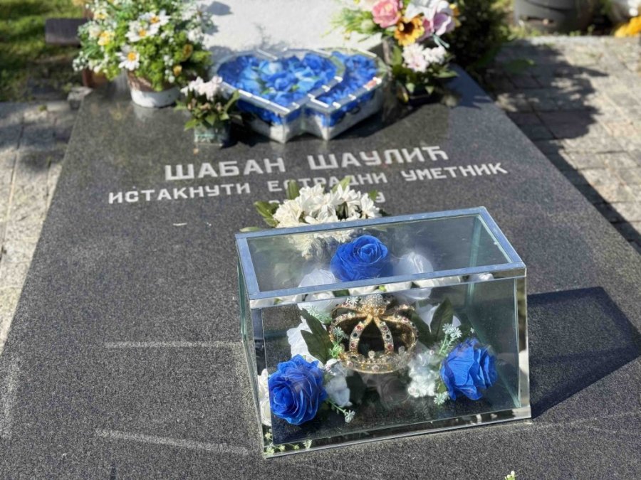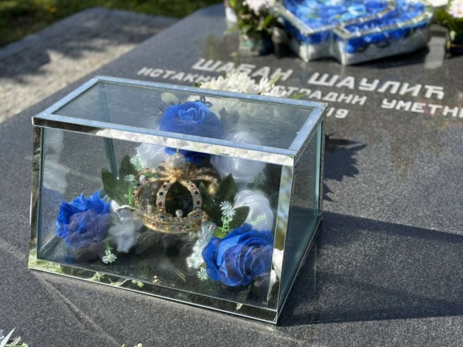 Na mermernoj ploči, među svežim cvećem, položen je simbol koji na najmoćniji način opisuje Šabanov lik i delo – zlatna kruna ukrašena draguljima.