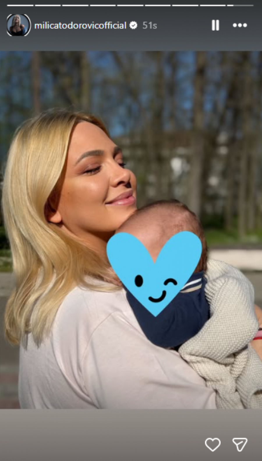 Iako je prethodni period bio turbulentan i praćen velikom pažnjom javnosti, Milica je odlučila da se ne osvrće na negativne stvari, već da se posveti majčinstvu i najlepšim trenucima sa svojim naslednikom. Sudeći po objavi iz Kruševca, pevačica praznik provodi spokojno, okružena porodicom i osmehom svog sina, što joj je trenutno najveća radost.