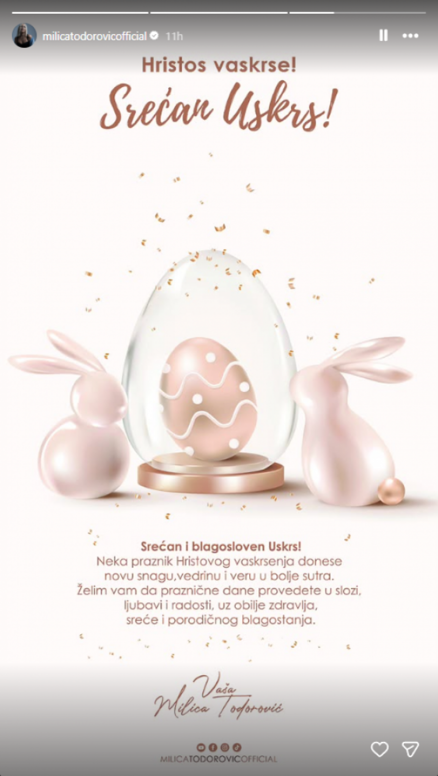 Milica Todorović oglasila se na Vaskrs iz rodnog Kruševca, gde praznične dane provodi u porodičnom domu zajedno s najbližima. Popularna pevačica je iskoristila priliku da svojim pratiocima uputi iskrenu i toplu čestitku povodom najvećeg hrišćanskog praznika, a ovogodišnje slavlje za nju ima posebno emotivan značaj.