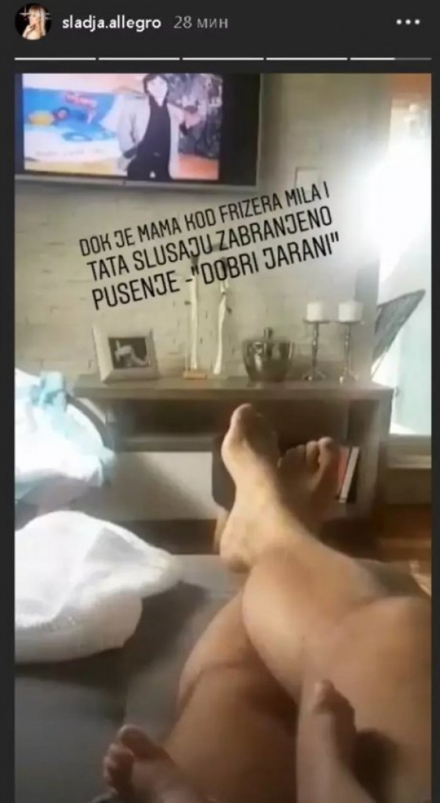 - Dok je mama kod frizera, Mila i tata slušaju Zabranjeno pušenje - ,,Dobri jarani" - napisala je Slađa u opisu Insta storija.
