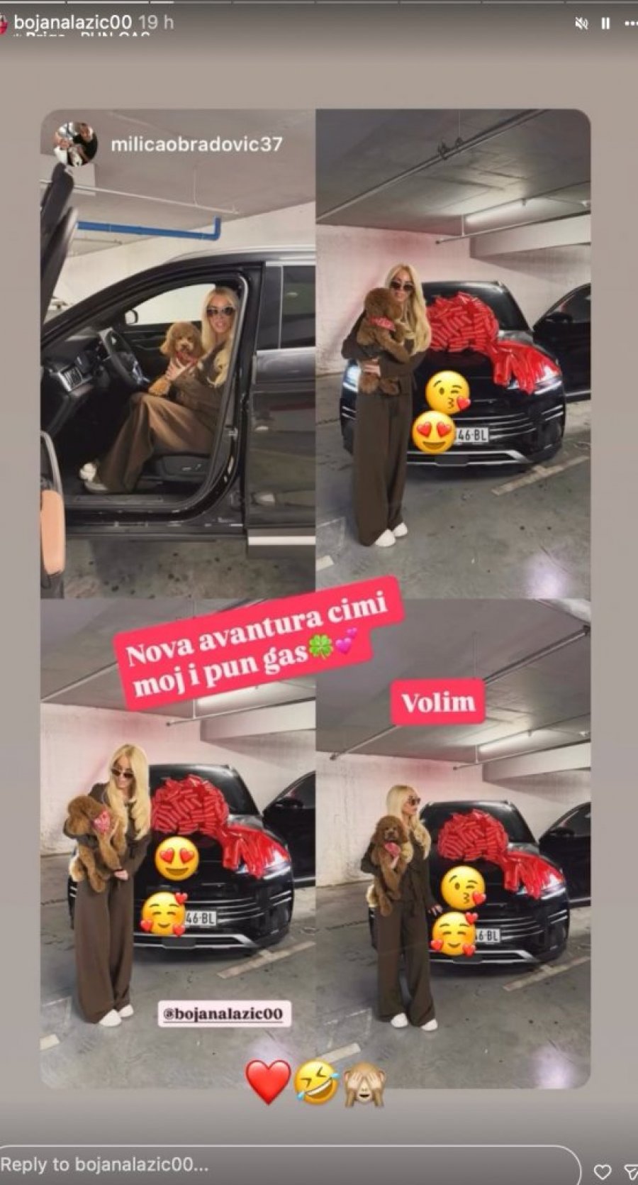 Bojana je na svom Instagram profilu objavila nekoliko fotografija na kojima se vidi njen novi četvorotočkaš, ali i ona sama kako ponosno pozira pored njega. Na nekim slikama pridružio joj se i njen ljubimac, što je dodatno omekšalo i ulepšalo ceo prizor. Njeni pratioci nisu krili oduševljenje, te su joj u komentarima upućivali brojne čestitke i lepe želje, pre svega da je automobil dugo i bezbedno služi.