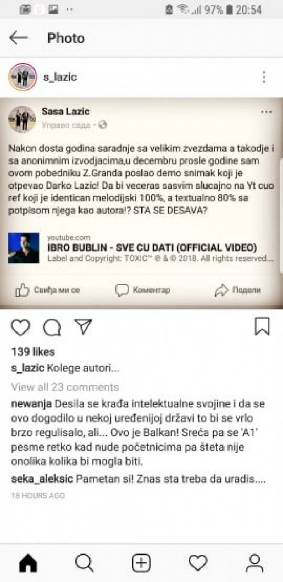 Ipak, kako saznajemo, reč je o prevari, odnosno krađi intelektualne svojine koju je Ibro izvršio nad Sašom Lazićem, našim kompozitorom i tekstopiscem koji sarađije sa mnogim srpskim pevačima.