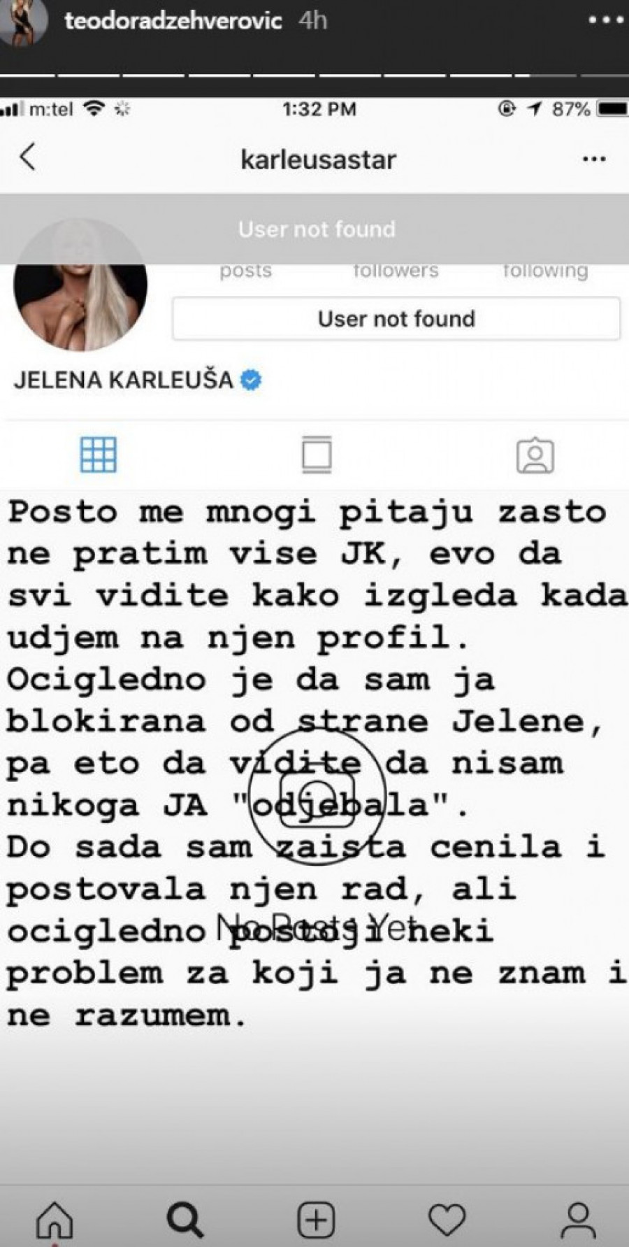 – Pošto me mnogi pitaju zašto ne pratim više JK, evo da vidite kako izgleda kada uđem na njen profil. Očigledno je da sam ja blokirana od strane Jelene, pa eto da vidite da nisam nikoga ja „odje*ala“. Do sada sam zaista cenila i poštovala njen rad, ali očigledno postoji neki problem za koji ja ne znam i ne razumem – navela je Teodora na Instagramu.