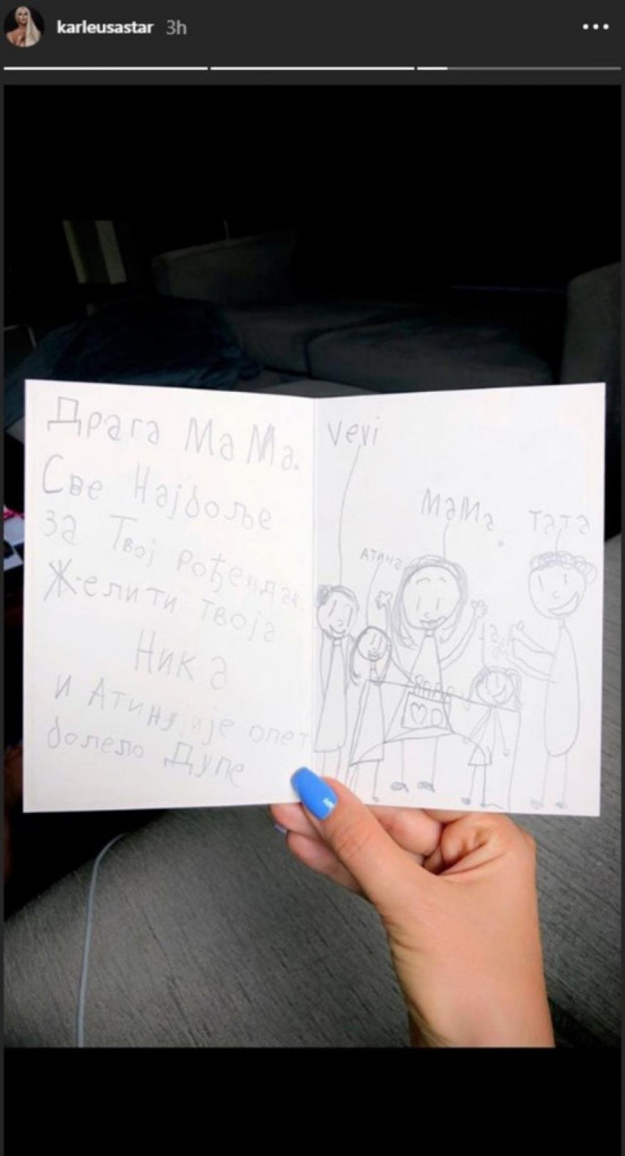 Jelena će svoj jubilarni rođendan proslaviti, verovatno u krugu porodice, a njene ćerke Atina i Nika već su joj predale poklon koji je Karleuša pokazala svima. Reč je o rođendanskoj čestitki koju joj je napisala mlađa ćerka, koja je malo je reći, duhovita.