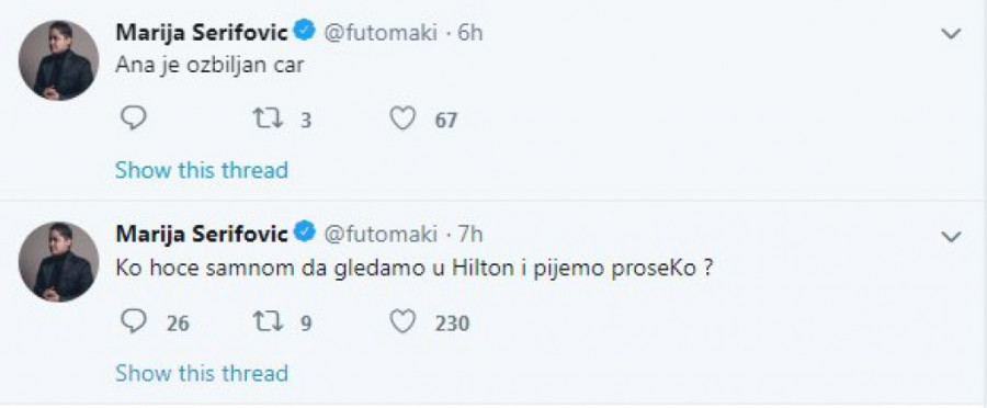 Ni Marija Šerifović, njena koleginica, nije ostala imuna na ovu Aninu izjavu, pa ju je ironično prokomentarisala na Tviteru.