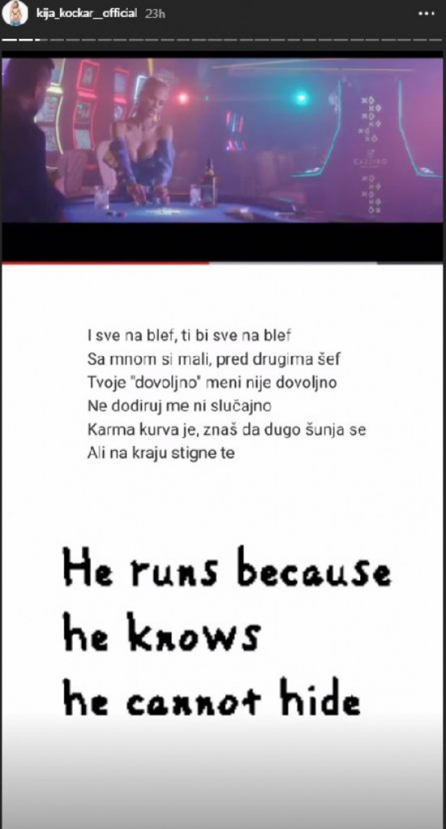 - I sve na blef, ti bi sve na blef. Sa mnom si mali, pred drugima šef. Tvoje "dovoljno" meni nije dovoljno, ne dodiruj me ni slučajno. Karma kurva je, znaš da dugo šunja se, ali na kraju stigne te - stihovi su pesme ''Mala plava'' koje je Kija objavila na svom storiju na Instagramu.