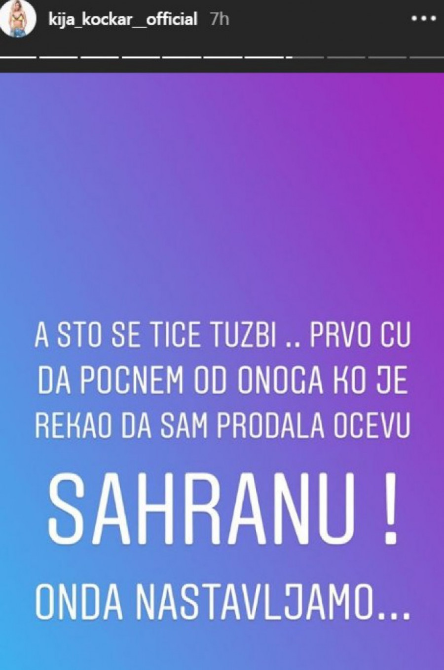 Ona je na svom Instagram nalogu napisala kako su tužbe spremne, da će prva biti upućena na Tamarinu adresu zbog toga što je izjavila kako je Kija prodala očevu sahranu.