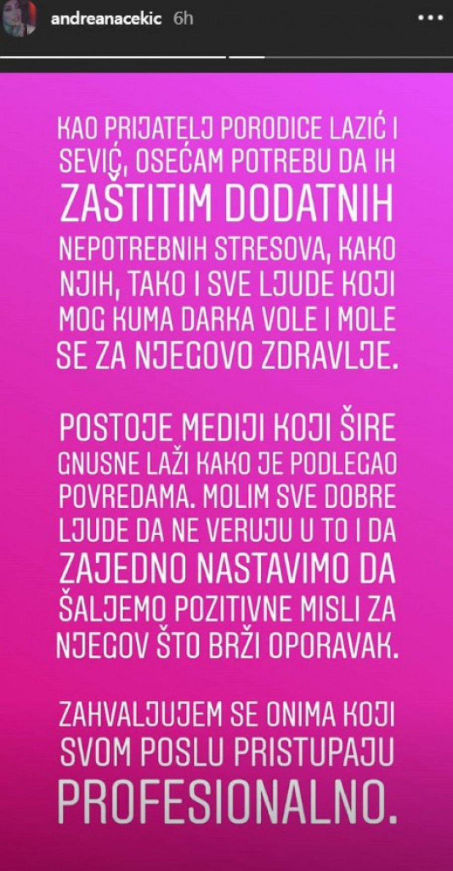 U vezi sa tim, njegova kuma Andreana Čekić se oglasila na društvenoj mreži Instagram i rekla sledeće: