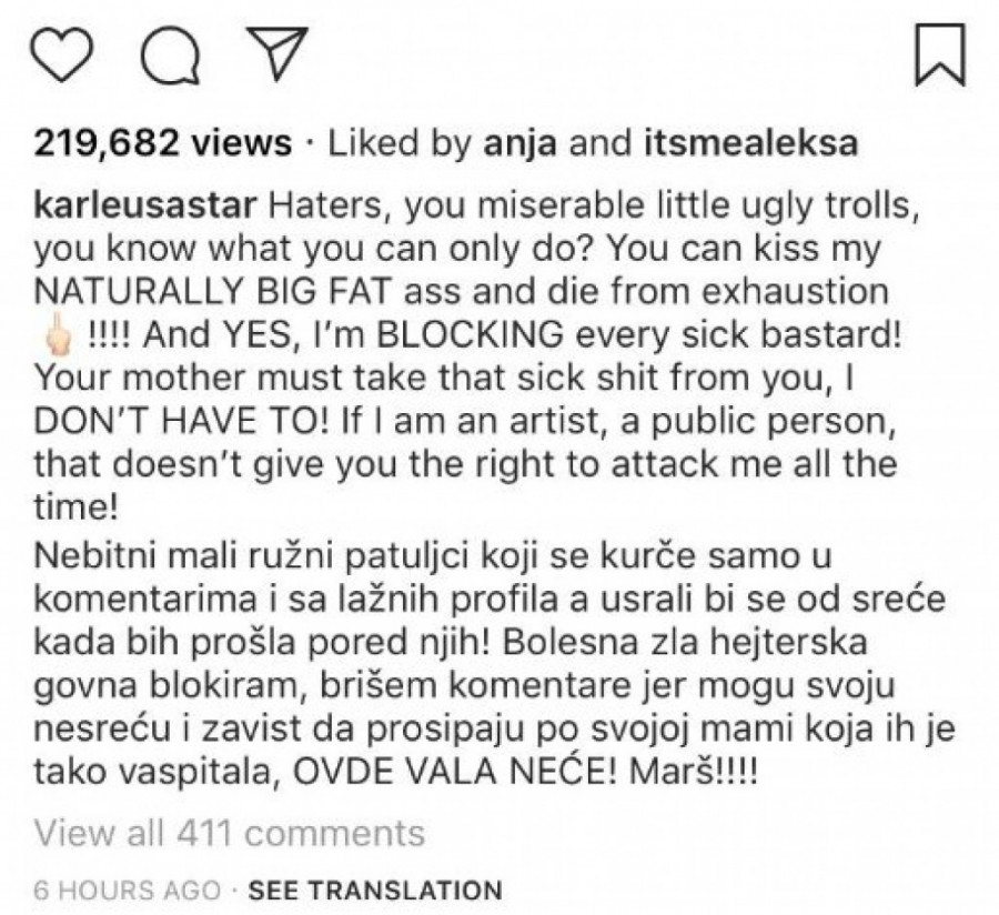 - Nebitni mali ružni patuljci koji se kurče samo u komentarima i sa lažnih profila a usrali bi se od sreće kada bih prošla pored njih! Bolesna zla hejterska govna blokiram, brišem komentare jer mogu svoju nesreću i zavist da prosipaju po svojoj mami koja ih je tako vaspitala, OVDE VALA NEĆE! Marš- prekipelo je srpskoj divi.