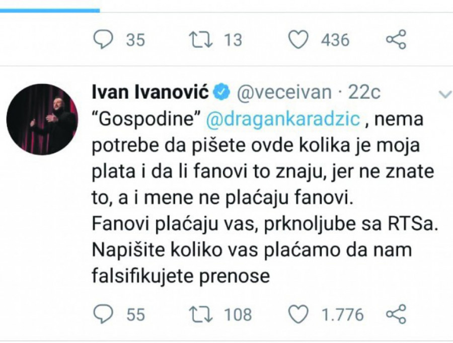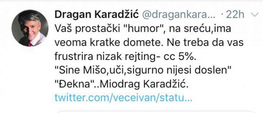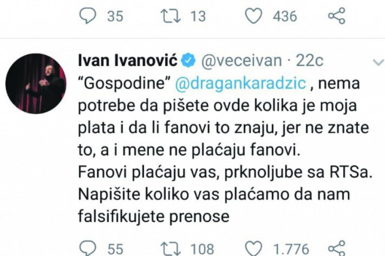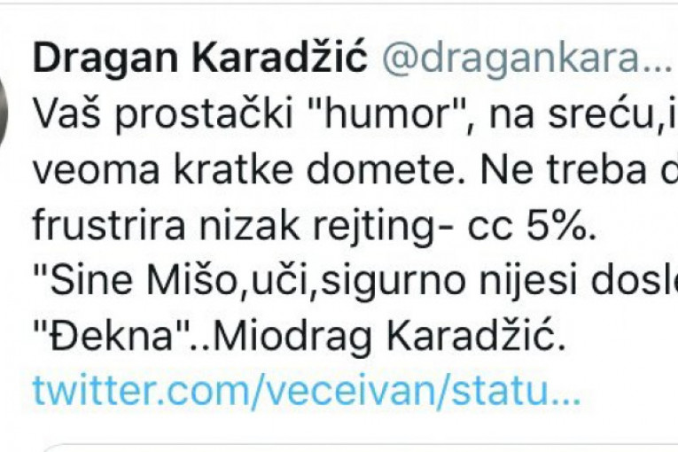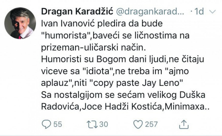 - Za termin u kojem vodi svoju emisiju Ivanović ima vrlo mali rejting, od svega pet posto. To ne kažem ja, nego statistika. Ivan ima više Tviter pratilaca nego gledalaca. Njegovu emisiju gleda 350.000 gledalaca, dok ga na Tviteru prati 650.000 ljudi. Publika ne može da se prevari izveštačenim humorom, odnosno humorom ulice, zato i ne treba da čude Ivanovićevi loši rezultati - kaže Karadžić i zaključuje da bi voleo da se sretne sa Ivanovićem kako bi se neposredno uverio u njegovu "duhovitost".
