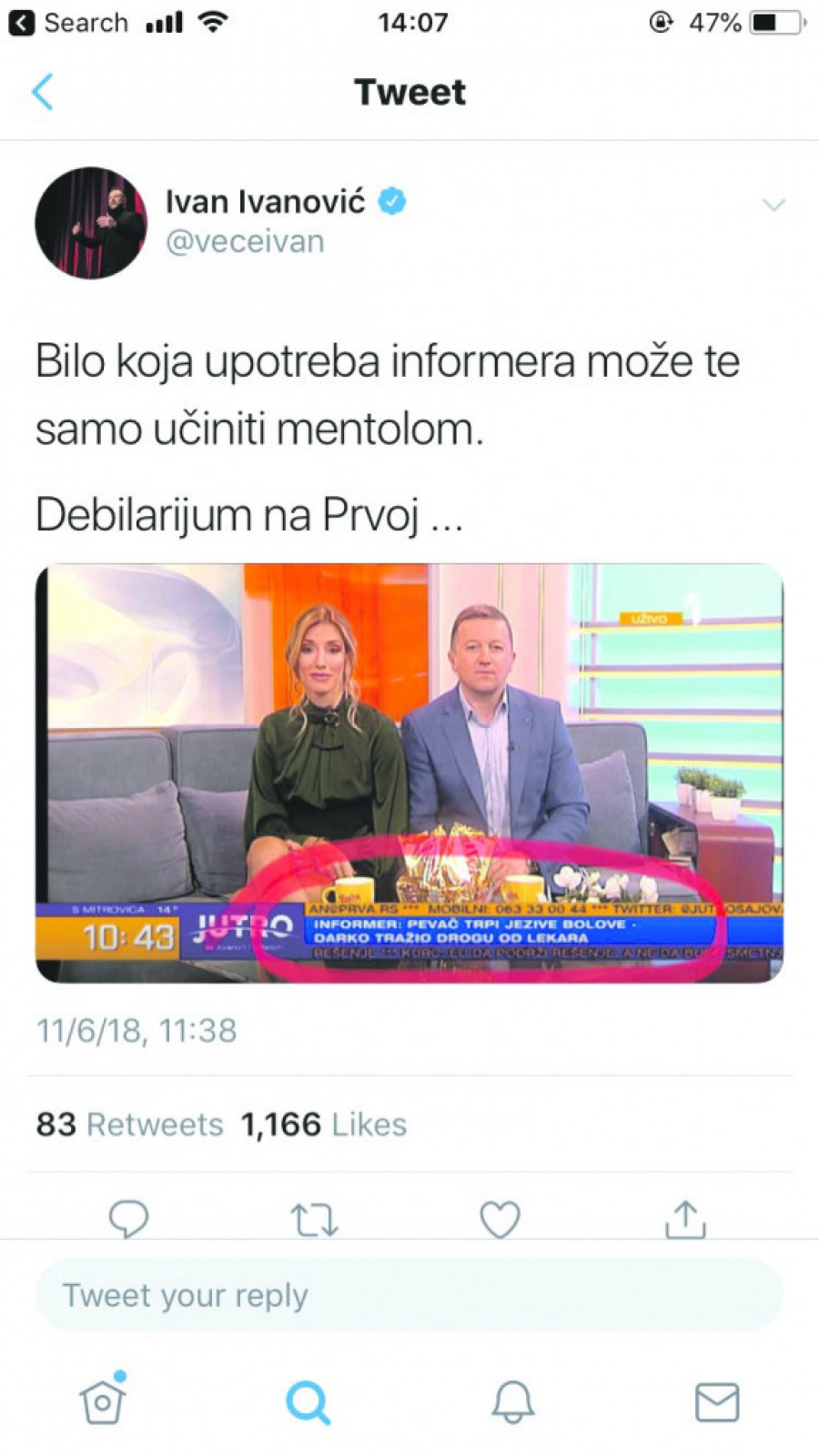 Zamenik predsednika upravnog odbora RTS Dragan Karadžić na svom Tviter nalogu je konstatovao da voditelj TV Prva Ivan Ivanović bezuspešno pokušava da bude humorista, baveći se ličnostima iz javnog života na prizeman i uličarski način, što je izazvalo gnev domaćina emisije "Veče sa Ivanom Ivanovićem".