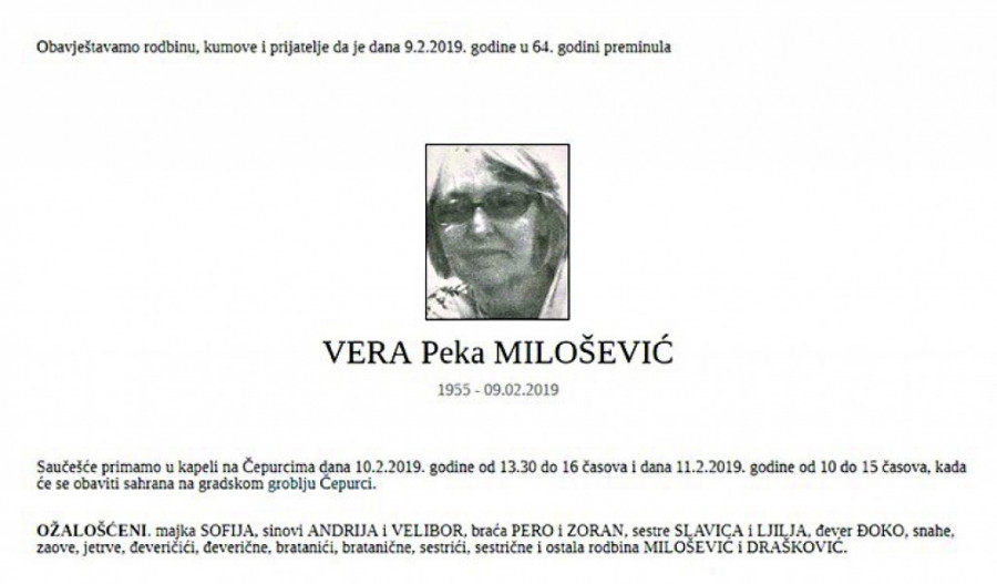 Majka glumca Andrije Miloševića Vera Milošević, preminula je 9. februara u 64. godini u Podgorici, a porodica je odlučila da je sahrani na gradskom groblju Čepurci.