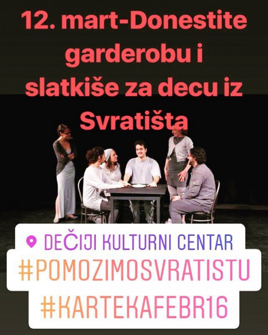 Pozorišna trupa U.R.A. i Dečiji kulturni centar Beograd pozivaju sve dobronamerne ljude da pogledaju predstavu "DAR" 12. marta sa početkom u 19.00, u Dečijem kulturnom centru Beograd i donesu donacije (garderobu, slatkiše, školski pribor i sredstva za higijenu za decu iz Svratišta). Deo prihoda od karata je takođe namenjen deci iz Svratišta.