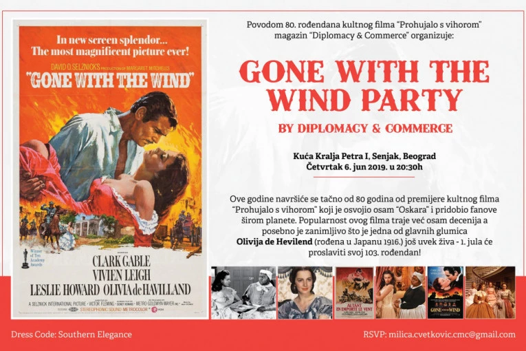 Stoga, povodom godišnjice ovog filma održaće se žurka pod nazivom "Gone with the Wind" u Kući kralja Petra I Karađorđevića na Senjaku u četvrtak 6. juna sa početkom u 20 časova i 30 minuta.