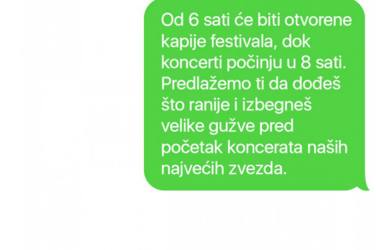 Od 18 časova će biti otvorene kapije festivala, dok koncerti počinju u 20 časova. Predlažemo ti da dođeš što ranije i izbegneš velike gužve pred početak koncerata naših najvećih zvezda.