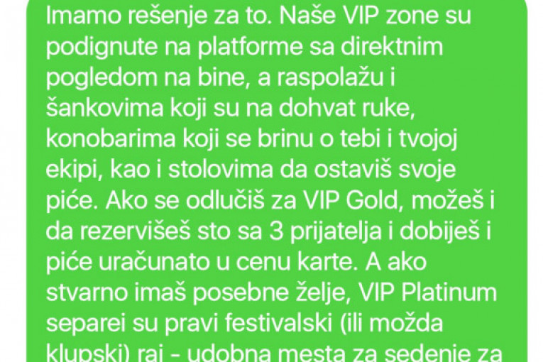 Imamo rešenje i za to. Naše VIP zone su podignute na platforme sa direktnim pogledom na bine, a raspolažu i šankovima koji su na dohvat ruke, konobarima koji se brinu o tebi i tvojoj ekipi, kao i stolovima da ostaviš svoje piće. Ako se odlučiš za VIP Gold, možeš i da rezervišeš sto sa tri prijatelja i dobiješ i piće uračunato u cenu karte. A ako stvarno imaš posebne želje, VIP Platinum separei su pravi festivalski raj - udobna mesta za sedenje za ekipu od šest ili 10 ljudi, najbolji pogled na festivalu i premium set pića uračunat u cenu rezervacije. I naravno, rezervacija parking mesta na par koraka od tvog VIP separea.