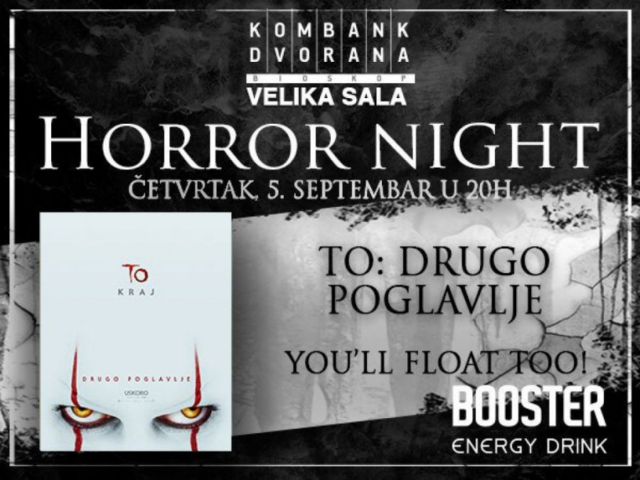 Specijalno Horor veče, posvećeno ljubiteljima horora, ali i svima koji željno iščekuju nastavak "horor avanture" TO (IT) iz 2017. godine, biće održano u četvrtak 5. septembra u 20h u Kombank Dvorani. Sve posetioce horor tematske večeri očekuju i pokloni iznenađenja.