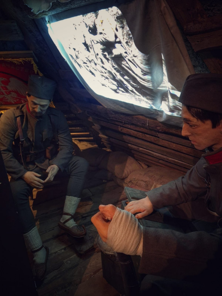 Drugi segment su dva improvizovana vojna rova – srpski i austrougarski kojima se teži da posetiocu budu dočarani uslovi u kojima je Milunka ratovala. Posetioci će ovde moći da vide vojnike, vojne uniforme, zastave, oružje...