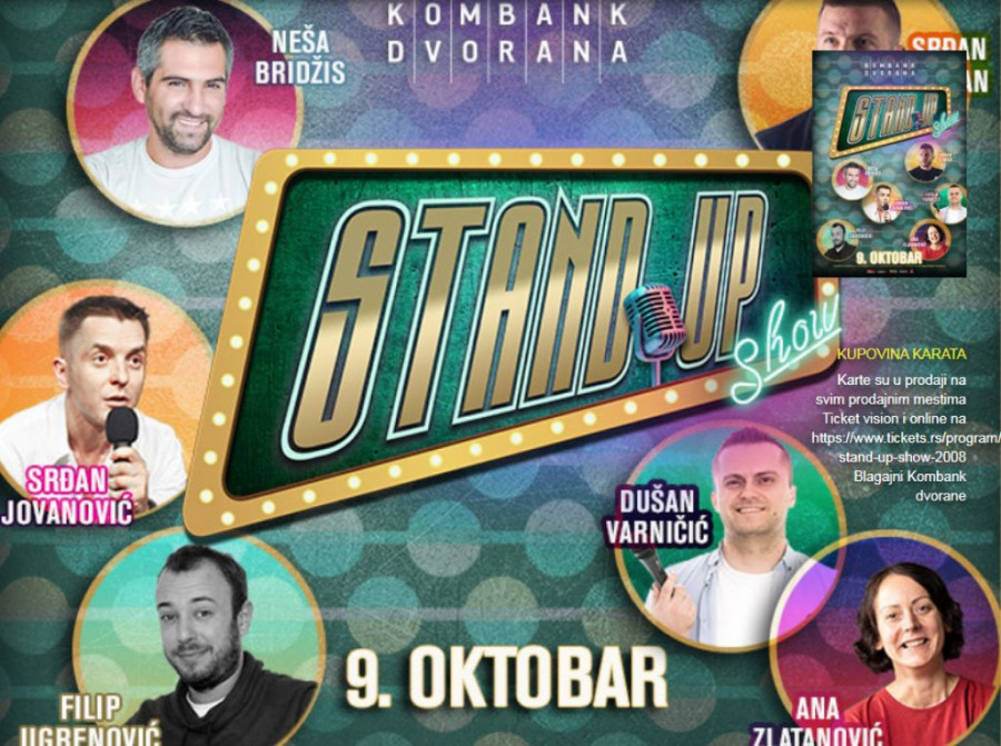 Foto: www.kombankdvorana.rsNajbrži čitalac koji nam pošalju mejl sa podacima o imenu i prezimenu i kontakt telefon na adresu marketing@srpskitelegraf.rs, nagradićemo sa 1x2 ulaznice za "Regionalni Stand up Show".