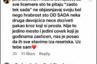 Hrabra devočičice, za sve licemere što se pitaju " zašto tek sad " ne objašnjavaj svoju bol nego hrabrost što OD SADA neka druga devojčica neće doživeti pakao kroz koji si prošla. Nije to jedino mesto i jedini čovek koji je godinama zaštićen, naš je posao da uh sve stavimo iza rešetaka. Uz tebe smo, napisala je Jelena Trivan.