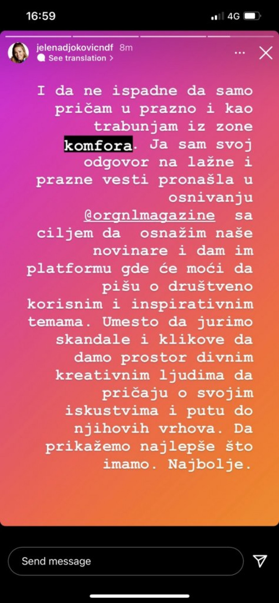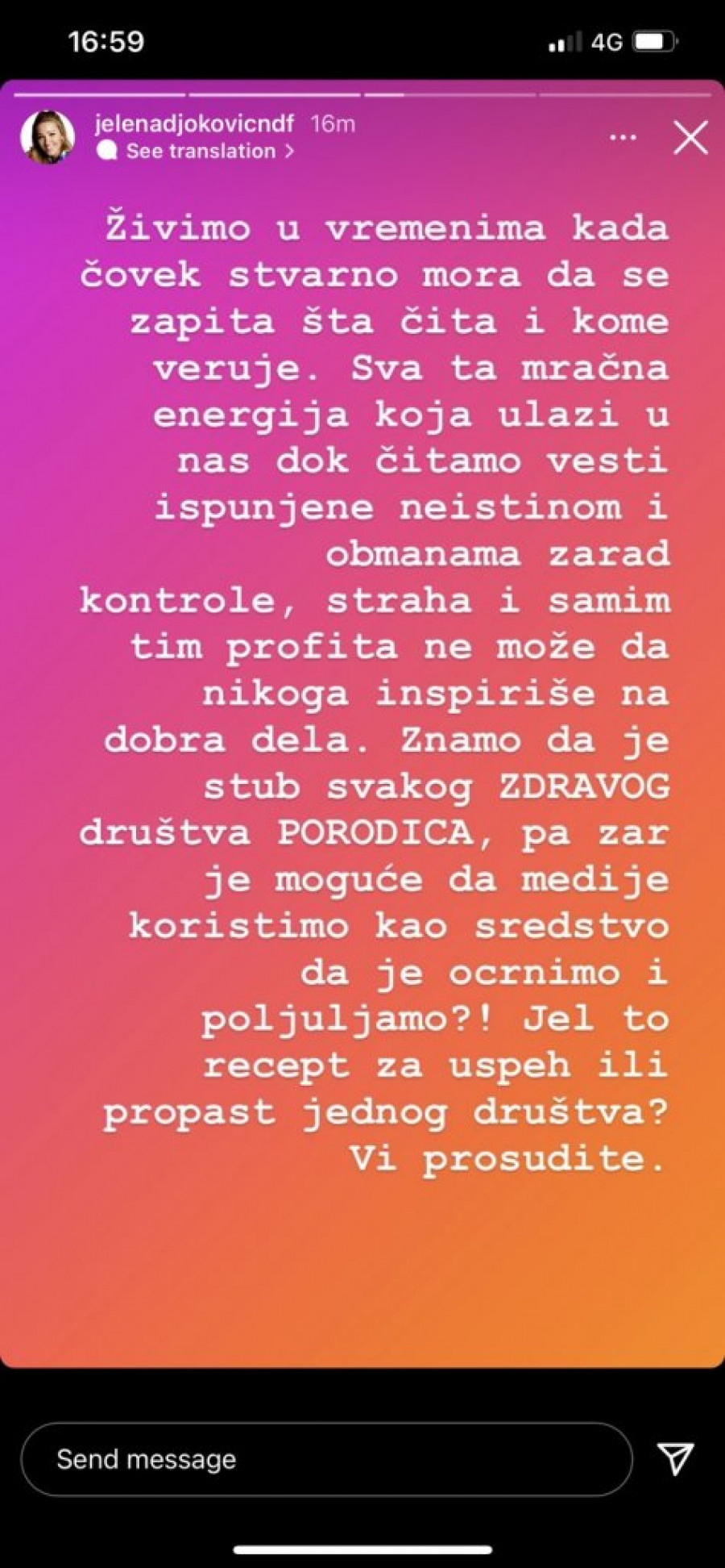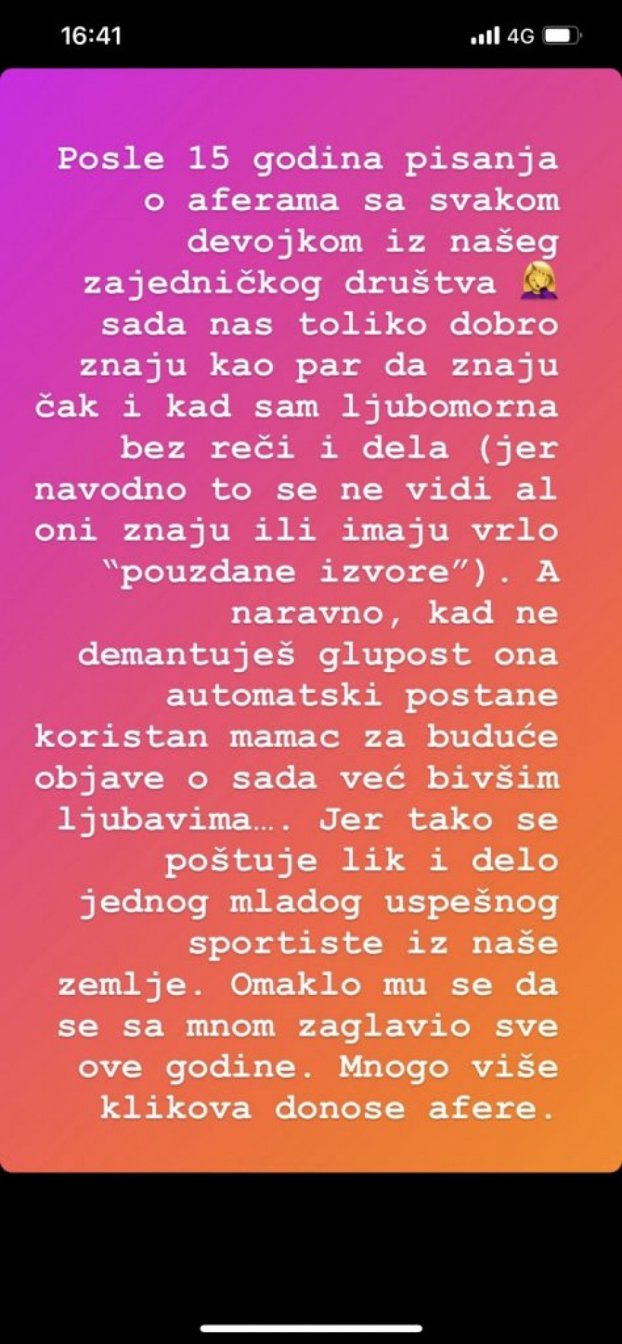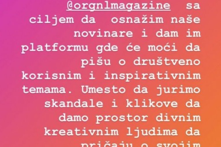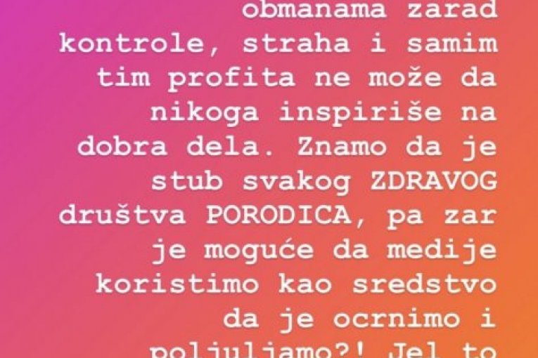 - Posle 15 godina pisanja o aferama sa svakom devojkom iz našeg zajedničkog društva sada nas toliko dobro znaju kao par da znaju čak i kada sam ljubomorna bez reči i dela (jer navodno to se ne vidi, ali oni znaju ili imaju vrlo "pouzdane izvore), a naravno kada ne demantuješ glupost, ona automatski postane koristan mamac za buduće objave o sada već bivšim ljubavima... Jer tako se poštuje lik i delo, jednog mladog, uspešnog sportiste iz naše zemlje. Omaklo mu se da se sa mnom zaglavio sve ove godine, mnogo više klikova donose afere. Živimo u vremenima kada čovek stvarno mora da se zapita šta čita i kome veruje. Sva ta mračna energija koja ulazi u nas dok čitamo vesti ispunjene neistinom i obmanama zarad kontrole, straha i samim tim profitima ne može da nikoga inspiriše na dobra dela. Znamo da je stub svakog zdravog duštva porodica, pa zar je moguće da medije korisitmo kao sredstvo da je ocrnimo i poljujamo?! Jel to recept za uspeh ili propast jednog društva? Vi prosudite. I da ne ispadne da samo pričam u prazno i kako trabunjam iz zone komfora. Ja sam svoj odgovor na lažne i prazne vesti pronašla u osnivanju "orgnlmagazine" sa ciljem da osnežim naše novinare i dam im platformu gde će moći da pišu društveno korisnim i inspirativnim temama. Umesto da jurimo skandale i klikove da samo prostor divnim kreativnim ljudima da pričaju o svojim iskustvima i putu do njihovih vrhova. Da prikažemo najlepše što imamo. Najbolje. - završila je Jelena na svom Instagram profilu.