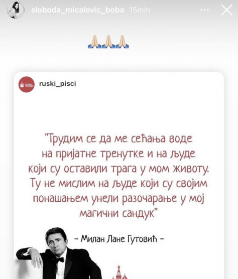 - Trudim se da me sećanja vode na prijatne trenuke i na ljude koji su ostavili traga u mom životu. Tu ne mislim na ljude koji su svojim ponašanjem uneli razočaranje u moj magični sanduk - napisala je Sloboda.