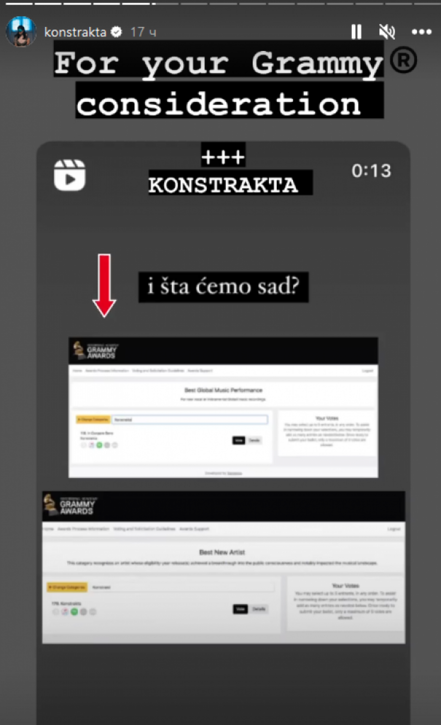 - Proširite glas i nekako ćemo možda putem misaonog presinga uspeti da dođemo do članova žirija preko naših rođaka iz Amerike, iz Los Anđelesa, Njujorka, Čikaga itd. Ima nas dosta svuda i eventualno ući ćemo u nomincije. Dajte da vidimo taj Gremi - poručila je Ana Ðurić Konstrakta.