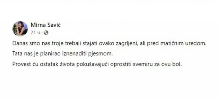 - Danas je trebalo da nas troje stojimo ovako zagrljeni, ali pred matičnom kancelarijom. Tata je planirao da nas iznenadi pesmom. Provešću ostatak života pokušavajući da oprostim svemiru za ovu bol - napisala je Mirna.
