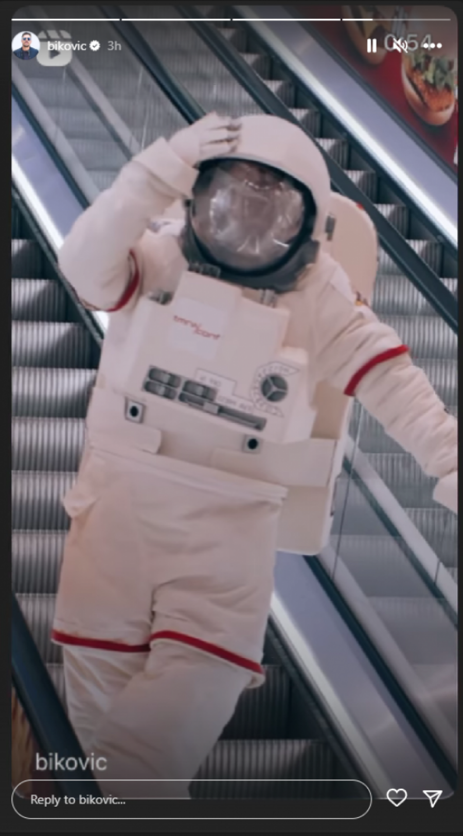 Iako su se znatiželjni ljubitelji naučne fantastike slikali sa "nepoznatim" astronautom, Biković je u jednom trenutku skinuo zaštitnu kacigu i iznenadio zabezeknute prolaznike u tržnom centru.
