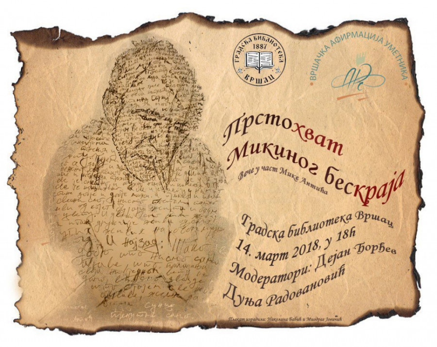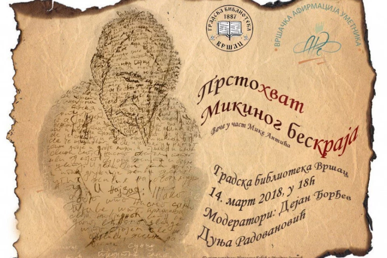 U Gradskoj biblioteci Vršac 14. marta (18 časova), upravo na dan kada se ukrštaju sva mnogobrojna rođenja i beskrajna umiranja Mike Antića, VAU ARS će prirediti ovom besmrtnom magu poezije memorijalno poetsko veče "Prstohvat Mikinog beskraja".