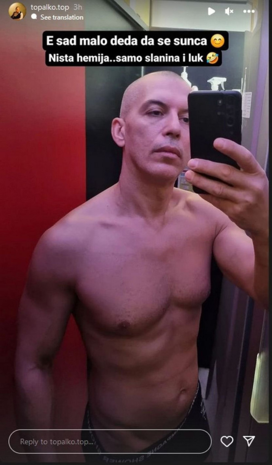Pevač Milan Topalović Topalko šokirao je javnost objavom na Instagramu, a sada je pozirao bez majice na sebi, pa se u ogledalu fotografisao dok je donji veš vukao na dole! Slika je postala virealna na društvenim mrežama, jer je pevač pokaza da je u dobroj formi u petoj deceniji, kao i da redovno vežba i vodi računa o svom izgledu.