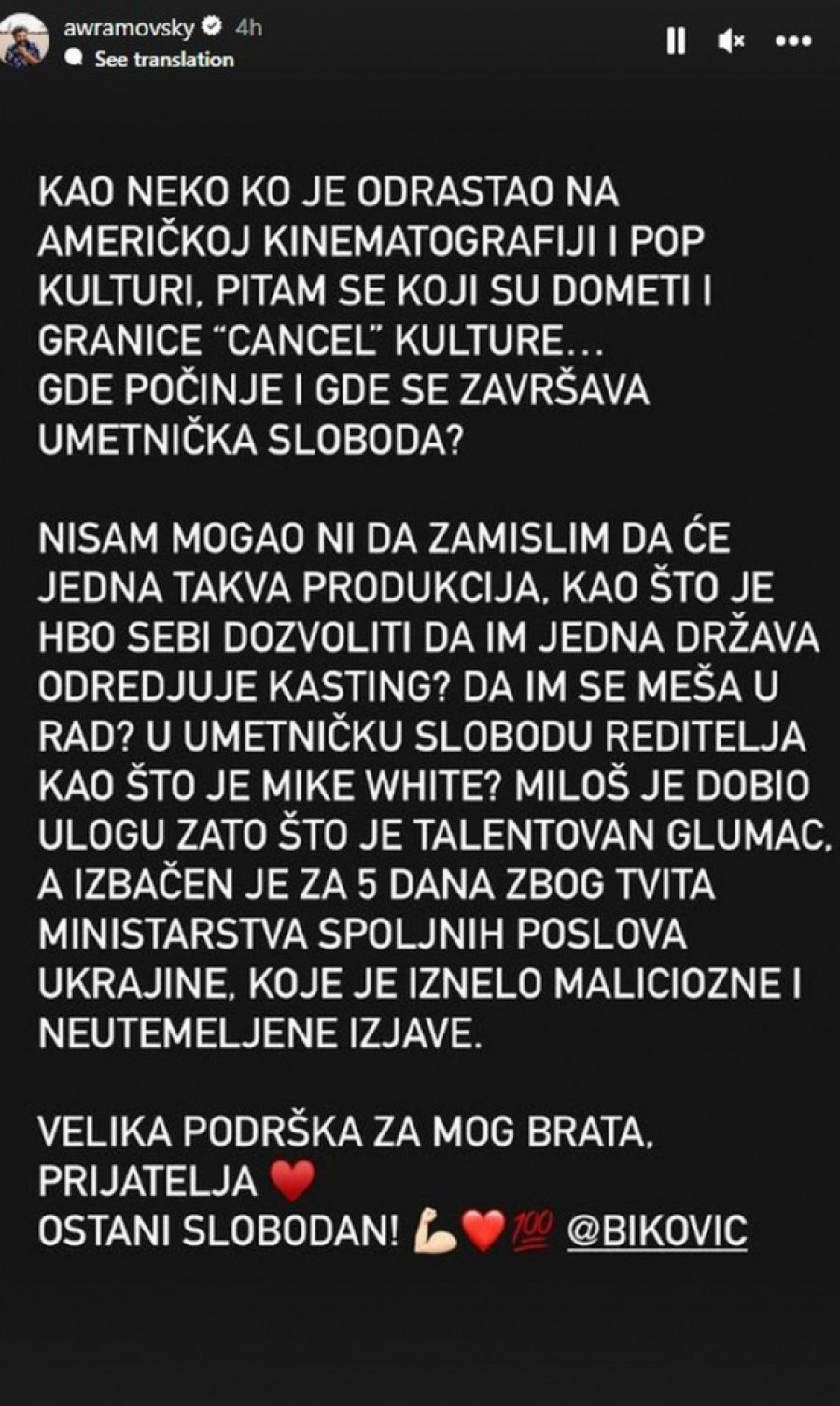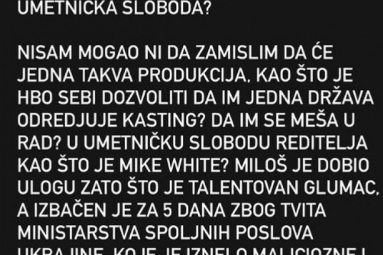 - Kao neko ko je odrastao na američkoj kinematografiji i pop kulturi, pitam se koji su dometi i granice "cancel" kulture... Gde počinje i gde se završava umetnička sloboda? Nisam mogao ni da zamislim da će jedna takva produkcija, kao što je HBO, sebi dozvoliti da im jedna država određuje kasting? Da im se meša u rad? U umetničku slobodu reditelja kao što je Majk Vajt? Miloš je dobio ulogu zato što je talentovan glumac, a izbačen je za pet dana zbog tvita ministarstva spoljnih poslova Ukrajine, koje je iznelo maliciozne i neutemeljene izjave. Velika podrška za mog brata, prijatelja. Ostani slobodan!