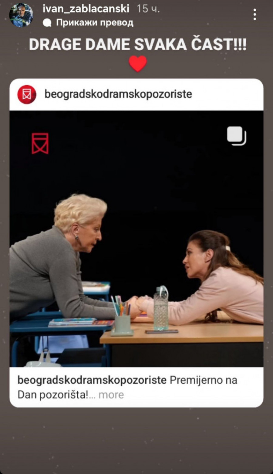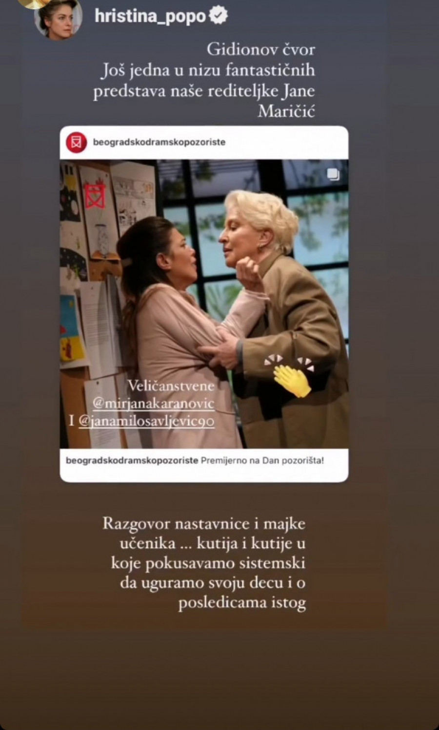 - "Gidionov čvor" je još jedna u nizu fantastičnih predstava naše rediteljke Jane Maričić - napisala je Popovićeva, dok je Ivan Zablačanski koleginicama Mirjani Karanović i Jani Milosavljević uputio čestitke.
