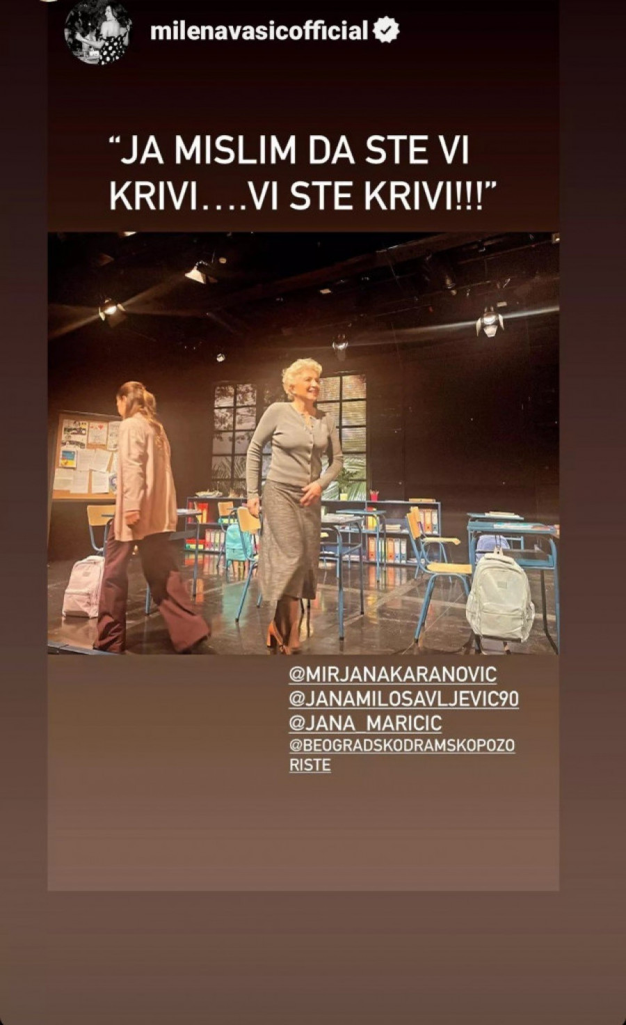 Predstavu je iz prvog reda pratila glumica Milena Vasić, koja je sve vreme brisala suze s lica, a svoje utiske o predstavi glumica Hristina Popović podelila je i na društvenim mrežama: