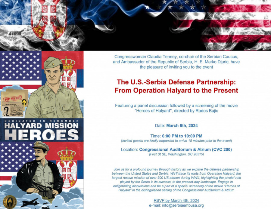 Kongresmenka Klaudija Teni, suosnivač Srpskog kongresa, i ambasador Republike Srbije, Njegova Ekselencija Marko Đurić, imaju zadovoljstvo da vas pozovu na događaj Američko-srpsko partnerstvo u odbrani: Od Operacije Halijard do danas. Panel diskusija će biti praćena prikazivanjem filma "Heroji Halijarda", reditelja Radosa Bajića.