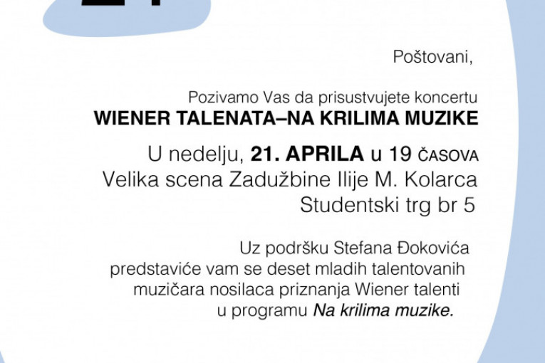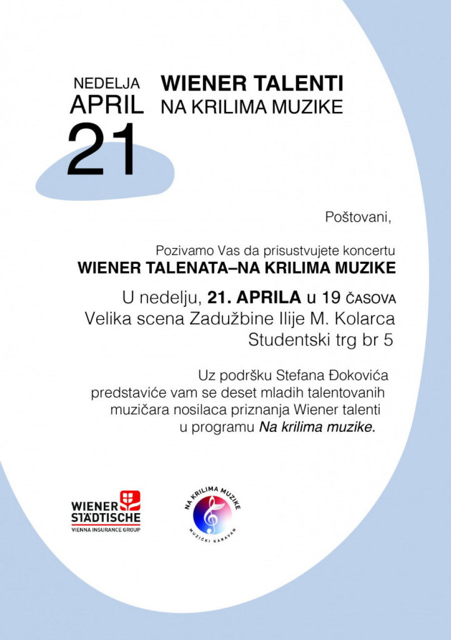 U Beogradu, u Velikoj dvorani Zadužbine Ilije M. Kolarca, u nedelju 21. aprila 2024. godine održaće se izuzetan događaj - koncert „Wiener talenti - Na krilima muzike".