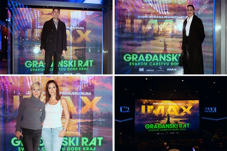 Blokbaster "Građanski rat: Svakom carstvu dođe kraj", najskuplji akcioni film reditelja Aleksa Garlanda, sinoć je stigao i u domaće bioskope, a premijeru u IMAX sali bioskopa Cineplexx Galerija u Beogradu nisu propustile ni poznate ličnosti.