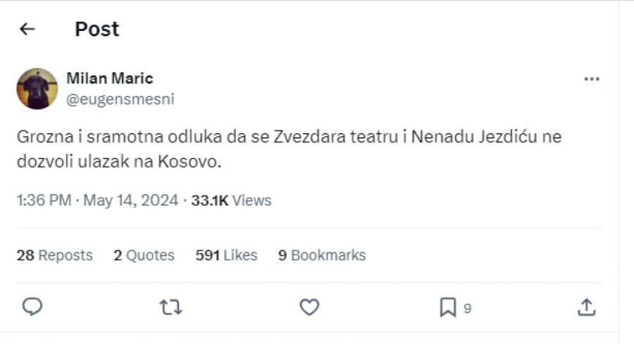 - Grozna i sramotna odluka da se Zvezdara teatru i Nenadu Jezdiću ne dozvoli ulazak na Kosovo - napisao je poznati glumac na društvenoj mreži Iks.