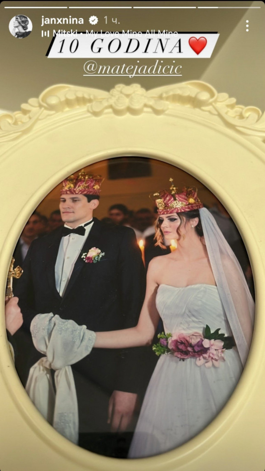 Glumica Nina Janković, udato Dičić, proslavlja 10 godina braka sa svojim izabranikom Matejom. Na današnji dan, pre deceniju, lepa Nina izgovorila je "sudbonosno da" i pred Bogom se zaklela na večnu ljubav Mateji Dičiću, sa kojim ima dvoje dece. Tim povodom objavila je stori na Instagramu koji je oduševio njene pratioce.