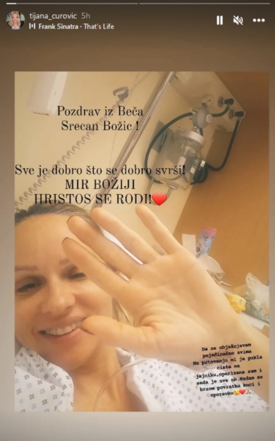 - U jednom trenutku sam osetila da gubim svest i samo sam rekla suprugu da pozove Hitnu pomoć, koja je došla za dvadesetak minuta. Pregledali su me i odvezli u bolnicu. Ultrazvuk je pokazao da u stomaku ima krvi. Doktorka Silvija iz Jermenije mi je objasnila da je stanje ozbiljno, da mi je pukla cista i da je neophodna operacija, kao i da je najgore što može da mi se desi da ostanem bez jajnika. Cista je najverovatnije pukla ujutru, trpela sam bolove čitavog dana, misleći da je u pitanju bezazlena stvar - napisala je glumica na Instagramu.